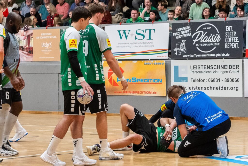 HG Saarlouis (grün) – HLZ Friesenheim-Hochdorf 2 (grau) : Saarlouiser Schrecksekunde: Kurz vor Schluß verletzt sich der Saarlouiser Hubert Kornecki schwer an der Schulter.