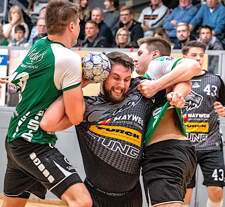 Das Team des Tabellenführers ließ sich auch eine ganze Weile lang von den SGSH Dragons aus dem Sauerland ärgern. Ursache dafür war sicherlich die Tatsache, daß Lützelberger nach zehn Spielen erstmals eine größere Umstellung in der Startformation vornehmen musste. Einmal fehlte mit Meti Durmishi eine wichtige Säule in Angriff und Abwehr, weil er mit dem Kosovo in der WM-Quali sein erstes Länderspiel in Großbritannien gewann (32:26). Zum Anderen musste Kapitän und Leader Tom Paetow nach einem kurzen Einsatz passen, weil er in der Vorbereitungswoche krank war. Und schließlich war es nach der schmerzlichen Niederlage in Nieder-Roden nicht besonders gut um das Selbstvertrauen des Teams bestellt.