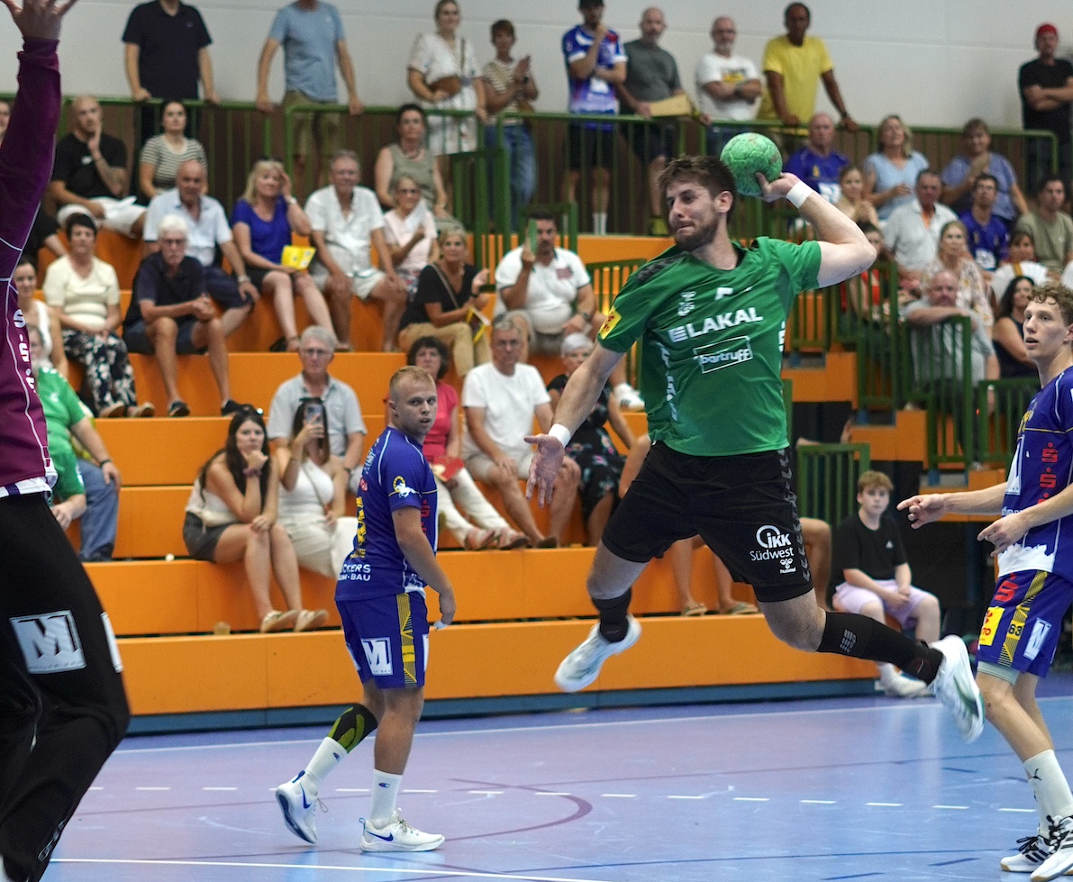 Mit acht Toren hinten – so konnte es nicht weitergehen. Und die Jungs gaben sich einen Ruck, Marcel Becker suchte vermehrt die Zweikämpfe, Tom Paetow übernahm Verantwortung und traf und hinten stand die Deckung aggressiver und besser. Der eingewechselte Michel Fiedler im Kasten steuerte nun auch die ersten Torwart-Paraden bei. Gut fünf Minuten vor dem Pausenpfiff hatten die Gäste nach einem Dreierpack (Paetow, Becker, Weißgerber) das Ergebnis auf 15:12 gestellt und waren wieder in Schlagdistanz. Zwei schnelle Treffer in der Schlussminute von Halbzeit 1durch Weissgerber und Kapitän Lars Walz sorgten für einen 17:15-Pausenstand, der auch bei den rund 60 mitgereisten Saarlouiser Fans die Hoffnungsflamme wieder heller leuchten ließ. Sie sorgten mit einer Riesen-Unterstützung (Kessler: „Besonders Dankeschön an den Fanclub und die Fans!“) trotz der heißen Temperaturen für den nötigen Rückhalt.
